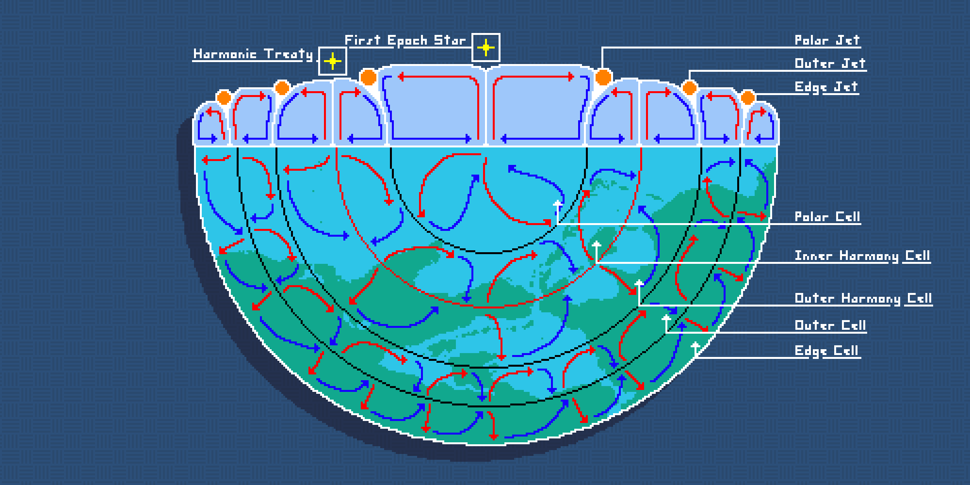 Air at the harmony line is heated more than air at the pole or edge and this causes a circulating effect wherein air from the harmony line becomes less dense and floats upwards, creating a low-pressure zone on the surface which pulls in more dense cold air. This warm air then travels outwards and starward, pulled by the orbit of the Treaty. This warm air cools as it moves away from the harmonic line, sinking back down and creating a high-pressure zone which pushes air away. This process creates what are referred to as atmospheric cells.